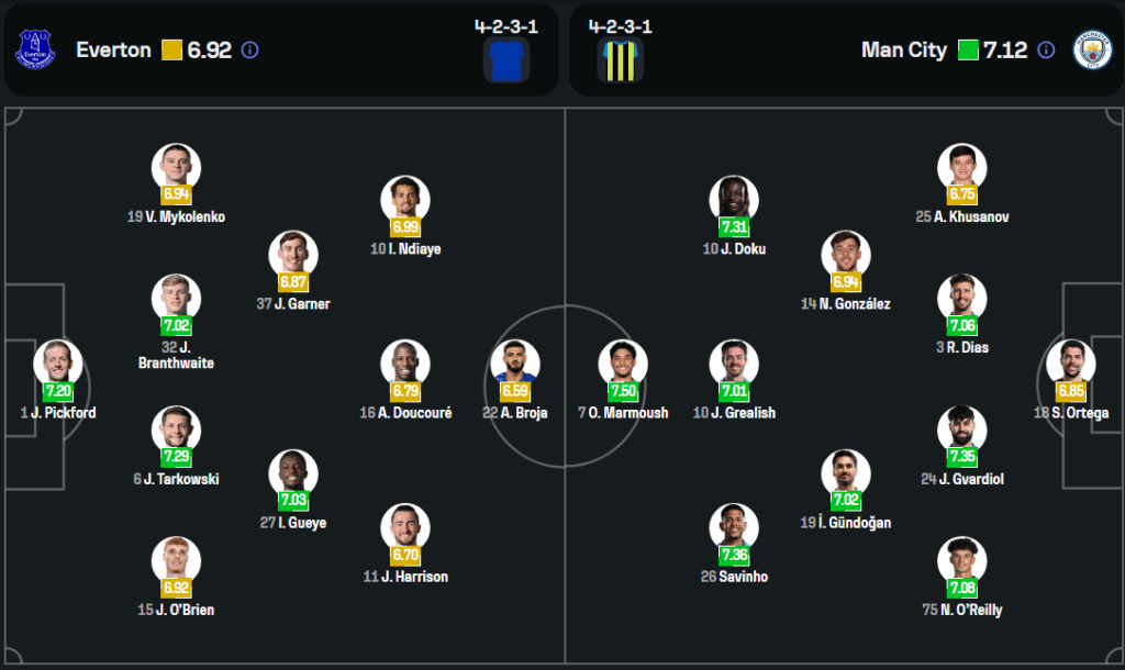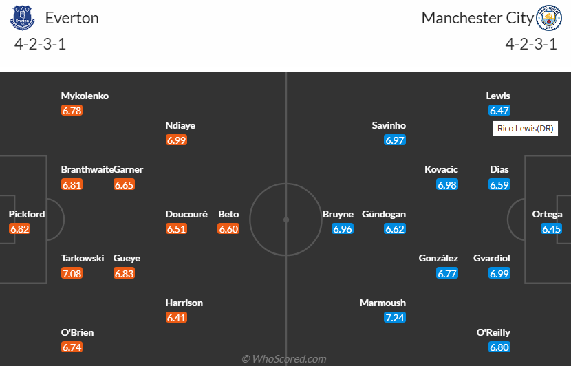 Пикфорд – О’Брайен, Тарковски, Брантуэйт, Миколенко – Гарнер, Гейе – Харрисон, Дукуре, Ндиайе – Бету