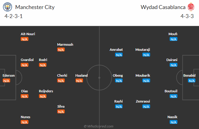 Ориентировочные составы на матч Первого тура Клубного чемпионата мира, где встретятся «Манчестер Сити» и марокканский «Видад» .