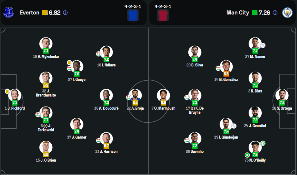 Ортега – Нунес, Диаш, Гвардиол, О’Райли – Гонсалес (Ковачич 78′), Гюндоган – Савиньо (Доку 78′), Де Брюйне (Аканжи 88′), Силва – Мармуш