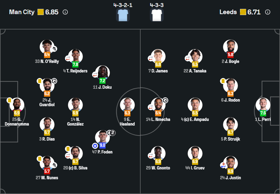 Доннарумма – Нуньеш, Диаш, Гвардиол, О’Райли – Силва (Мармуш 89′), Нико, Рейндерс (Шерки 75′) – Фоден, Холанд, Доку (Стоунз 90+6′)