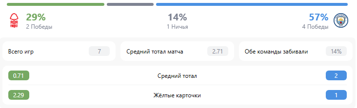 - В 6 из 7 последних матчей «Манчестер Сити» забивает больше 1.5 гола (кэф. 1.69)